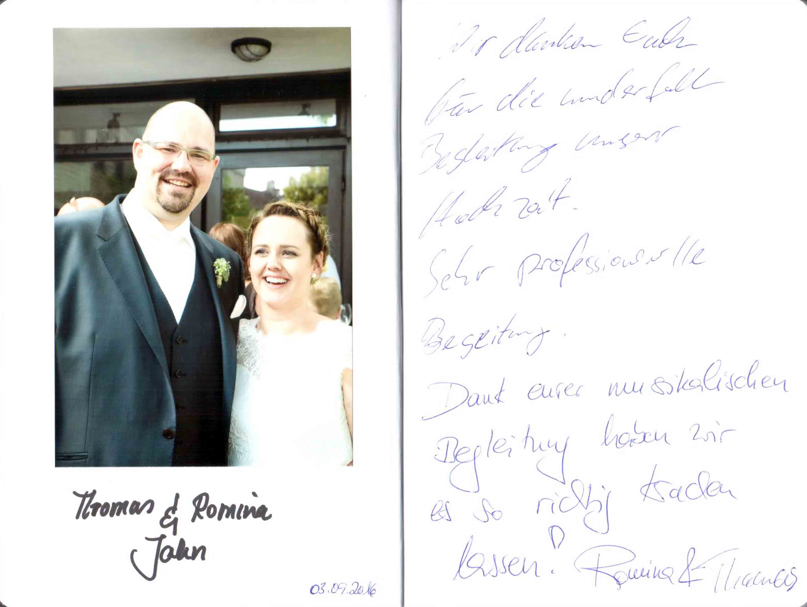 Romantik pur: Hallo Steffi, hallo Steffan, vielen Dank für die musikalische Begleitung unserer Hochzeit. Es war ein rundum gelungener Abend. Toll das es mit dem speziellen Wunschlied des Gastes auch auf Nachbestellung geklappt hat. Viel lieben Dank!