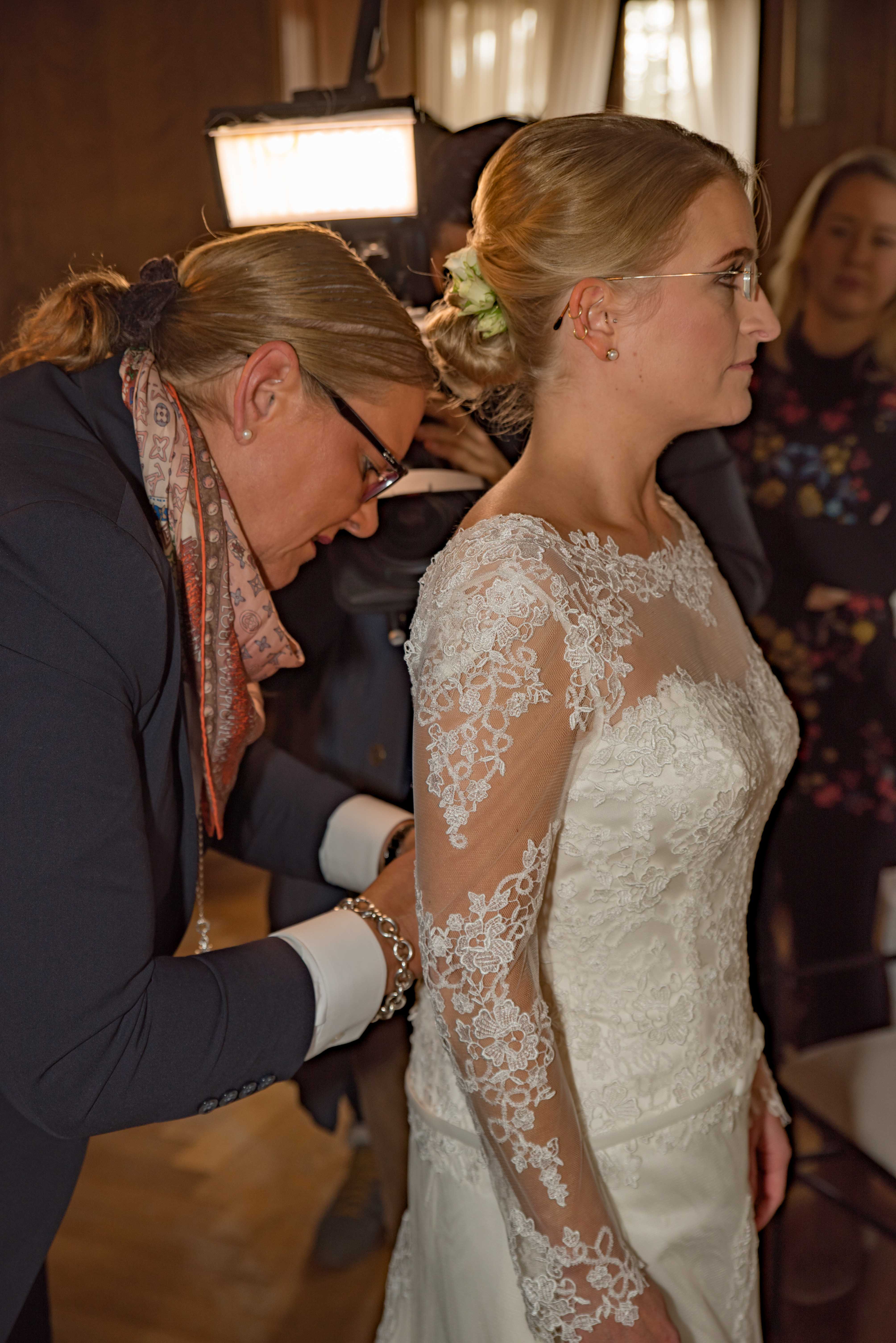 Sie hilft beim Anlegen des Schmuckes, steckt den Schleier fest, schiebt das Strumpfband in die richtige Position und hilft beim Schuhe anziehen.